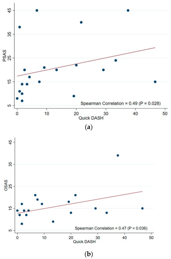 (a,b) The correlation analysis between (a) the Patient Scar Assessment Scale (PSAS) and the Quick Disabilities of the Arm, Shoulder, and Hand (DASH) score (Spearman correlation coefficient of 0.49, p = 0.028); and the (b) Observer Scar Assessment Scale (OSAS) and Quick Disabilities of the Arm, Shoulder, and Hand (DASH) score (Spearman correlation coefficient of 0.47, p = 0.036).
