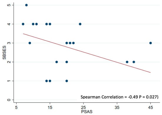 The correlation analysis between the Stony Brook Scar Evaluation Scale (SBSES) and Patient Scar Assessment Scale (PSAS) (Spearman correlation coefficient of −0.49, p = 0.027).