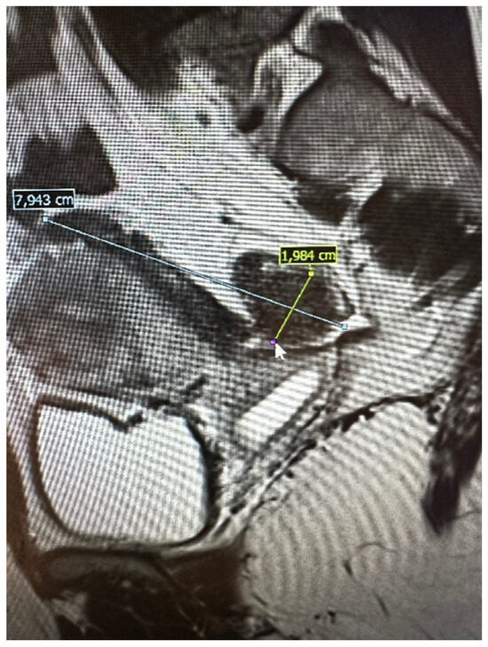 The pelvic MRI was conducted using a 3T scanner, following the established protocol for endometriosis. This included scans before and after the intravenous administration of a gadolinium-based contrast agent, as well as contrast administration into the vagina (using hyaluronic acid gel and a vaginal tampon) and rectum (using a water solution). Patients were positioned supine with a moderately filled bladder and received an intravenous anti-peristaltic agent (butyl-scopolamine). The procedure was performed following bowel preparation (BPP) and fasting the previous day. The examination typically lasted approximately 60 min. The report included the abdominal wall structures. An example of an MRI scan is shown in Figure 2.