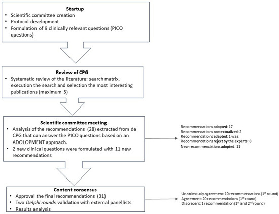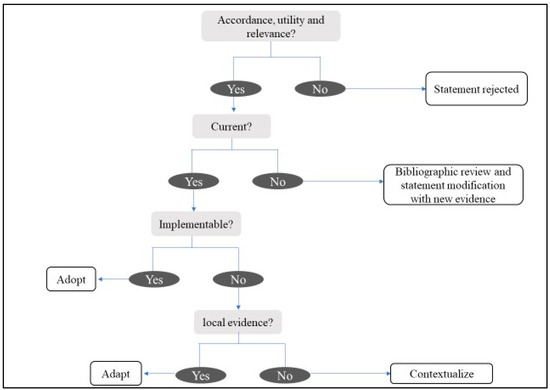 The recommendations were analyzed in a meeting with the scientific committee in May 2022, applying a structured process, in order to categorize them in terms of accordance, utility, relevance, validity, and feasibility for Central America and the Caribbean, based on an ADOLOPMENT approach [26,27]. This approach combines the advantages of adoption, adaption, and de novo development of guidelines and facilitates structured interaction and deliberation with experts during meetings saving important resources [27] (See Figure 2).