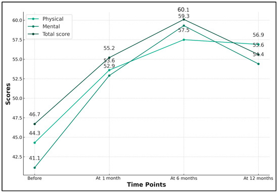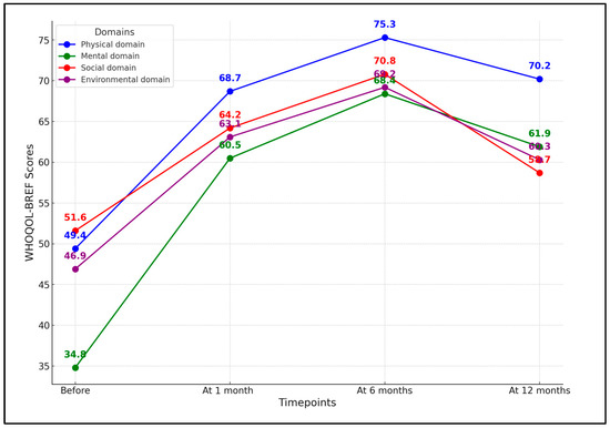 In the social domain, the initial score of 51.6 ± 12.6 increased to 64.2 ± 11.3 after treatment, peaked at 70.8 ± 10.5 at 6 months, and then decreased to 58.7 ± 9.4 at 12 months. Despite the decrease, the 12-month score was still higher than the pre-treatment score and the changes across the time points were statistically significant (p < 0.001). Finally, the environmental domain showed a rise from 46.9 ± 13.1 before treatment to 63.1 ± 12.7 after treatment. This score further increased to 69.2 ± 11.6 at 6 months and then dropped to 60.3 ± 13.3 at 12 months. Like the other domains, the p-value was <0.001, indicating significant improvements, as presented in Table 2 and Figure 2.
