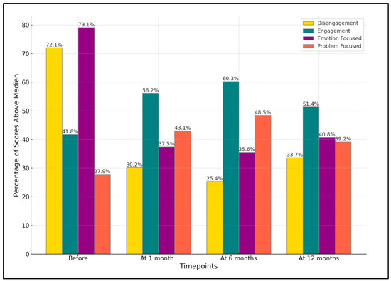 Conversely, engagement, as a coping strategy, was initially lower (41.8%) before treatment. This percentage increased to 56.2% after treatment, peaked at 60.3% at 6 months, and then slightly decreased to 51.4% at 12 months (p-value = 0.034). The use of emotion-focused coping strategies showed a pattern similar to disengagement. Though initially high at 79.1%, it significantly decreased to 37.5% after treatment, slightly dropped to 35.6% at 6 months, and then increased to 40.8% at 12 months (p-value < 0.001).