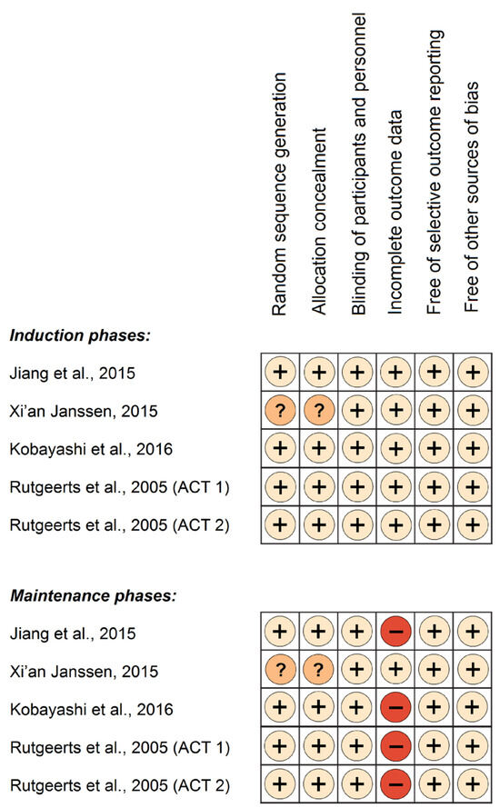 Risk of bias assessment of clinical trials’ induction and maintenance phases. Symbols: (+), low risk of bias; (−), high risk of bias; (?), unclear risk of bias, [40,41,42,43].