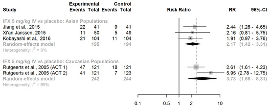In adults with moderately to severely active UC who were treatment-naive with biologic therapies, IFX (given intravenously at a dose of 5 mg/kg at weeks 0, 2, and 6) displayed efficacy in inducing clinical remission, both in Asian (RR = 2.17, 95% CI: 1.42–3.31) and Caucasian patients (RR = 3.73, 95% CI: 1.68–8.31; Figure 3).