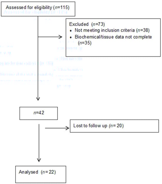 We reviewed computerized results of renal biopsies obtained at the Department of Internal Medicine, Nephrology Division, Genoa University, and IRCCS AOU San Martino, Genoa, Italy, from May 2007 to June 2011, in which SA-β-Gal staining was available. The review included subjects aged 18 years or older, with or without type 2 diabetes, with a urinary protein excretion of 150–10,000 mg/day, and an eGFR of 25–120 mL/min per 1.73 m2. All biopsies were performed not for research but for clinical reasons. The results obtained for FSGS have been recently published []. This study was part of a larger study on cell senescence and the kidney sponsored by the Ministero dell’Università e della Ricerca Scientifica [MIUR] [Progetti Finalizzati per la Ricerca di Base-FIRB 2002] and approved by the Ethical Committee of the Azienda Ospedale San Martino (Ref. N.72006) [,]. The procedures were in accordance with the Declaration of Helsinki. All kidney biopsy specimens were analyzed by the same renal pathologist. Estimated GFR was assessed by CKD-EPI formula []. One hundred and fifteen consecutive kidney biopsy cases in which SA-β-Gal activity was available were assessed for eligibility [Figure 1].