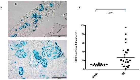 (A,B) Representative images of SA-β-Gal tubular expression in CKD patients. SA-β-Gal assay was ~2.6-fold higher [p < 0.025] in the tubular compartment of biopsies of CKD patients than of controls. Magnification × 200. SA-β-Gal, senescence-associated β-galactosidase; scale bar = 150–75 µm. * = p < 0.025.