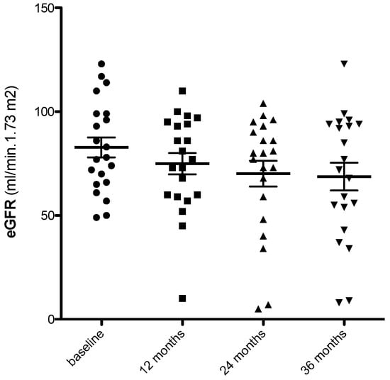 Estimated GFR (eGFR) during the study (means, 5–95th percentiles). Mean eGFR was 80 ± 5.7 mL/min/1.73 m2 at baseline, 75 ± 5 mL/min/1.73 m2 at year 1, 70 ± 6.1 mL/min/1.73 m2 at year 2, and 69 ± 6.7 mL/min/1.73 m2 at year 3. Mean change in eGFR from baseline to year 3 was −3.54 [95% CI, −0.598 to −6.48] mL/min/1.73 m2/year.