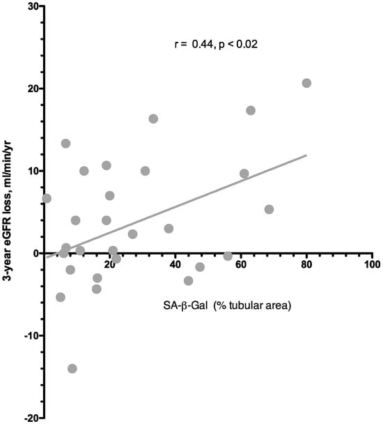 In addition to its recognized role as a marker of cell senescence [,], SA-β-Gal, at high enzyme activity, can injury the basement membranes through hydrolysis of proteoglycans glycosidic bonds [,]. Even as low as 10% of senescent cells in tissues appears to be sufficient to cause damage and dysfunction in studies with in vitro and in vivo models []. However, no information is available in humans on the percentage of tubular SA-β-Gal expression which is associated with kidney damage. In our study, contrarywise to in vitro studies [], a low (10–20%) expression of SA-β-Gal in kidney tubules was associated with limited or no eGFR loss at the follow up. From the study of the regression line between SA-β-Gal activity and a loss of eGFR, a “fast” progression rate, i.e., an eGFR loss > 3.5 mL/min year, was observed when the percentage of SA-β-Gal in tubuli was >30%. Our data therefore suggest that in human kidney disease, the predictive cut-off for tubular SA-β-Gal detection is greater than suggested by in vitro studies. Clearly, our data are preliminary, and ad hoc analyses need to be performed in larger studies.