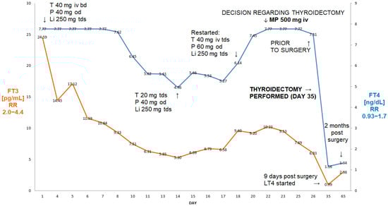 He initially responded to high-dose intravenous thiamazole (Thiamazol 40 mg inject, Henning®, Sanofi, France), 40 mg tds, lithium carbonate, 250 mg tds and oral prednisone (Encorton®, Adamed Pharma, Poland) and 40 mg od, i.e., after 11 days, his FT3 was 5.4 pg/mL, FT4—4.96 ng/dL, but after the change to oral thiamazole (20 mg tds), there was a rebound increase in FT3 (to 9.6 pg/mL) and FT4 (to 6.14 ng/dL), followed by episodes of rapid atrial fibrillation, despite an increase in oral prednisone to 60 mg od and thiamazole to 40 mg tds from day 18 (Figure 1). This prompted his admission to the Department of Cardiology, where he was treated with high-dose intravenous metoprolol, diuretics and spironolactone in view of developing oedema. The re-administration of intravenous thiamazole prevented an increase in FT3, but there was a further increase in FT4 (>7.77 ng/dL)—see Figure 1. Despite the use of high-dose beta-blockers (bisoprolol 20 mg/day), he remained persistently tachycardic, with about 120 beats per minute. On the 24th day of admission, he was therefore referred for an emergency thyroidectomy. The administration of 500 mg of ivMP (in addition to oral prednisone) within 72 h resulted in a 41% decrease in FT3 from 10.23 pg/mL to 6.03 pg/mL (2.0–4.4), i.e., finally only 37% above the upper reference range. Following the administration of two units of fresh frozen plasma (in order to enhance further thyroid hormone binding), he underwent successful total thyroidectomy on day 27 post-admission. Nine days after the thyroidectomy, his TSH was still suppressed at 0.005 µIU/mL, but his FT3 and FT4 were low (FT3—0.99 pg/mL, FT4—1.16 ng/dL, respectively), and levothyroxine was stated. He remains currently euthyroid on levothyroxine 150 µg od. His planned cardioversion was cancelled as he reverted spontaneously to a sinus rhythm about two months post-surgery.
