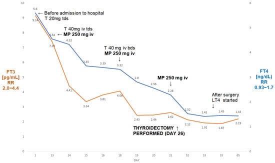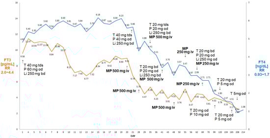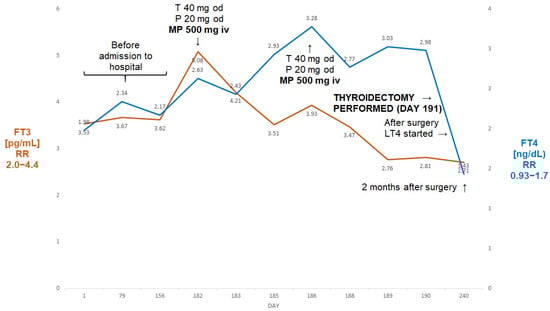 On admission, his FT3 was 7.39 pg/mL, FT4 was 4.54 ng/dL, and TSH was <0.005 µIU/mL. During admission to our department, he received treatment for thyrotoxicosis with high doses of intravenous thiamazole (120 mg/day, later reduced to 80 mg/day), together with MP iv pulses (three pulses of 250 mg intravenously each)—see Figure 2. This was followed by s normalisation of FT3 (from 7.39 pg/mL to 2.44 pg/mL), and a fall in FT4 from 4.54 ng/dL to 2.28 ng/dL.