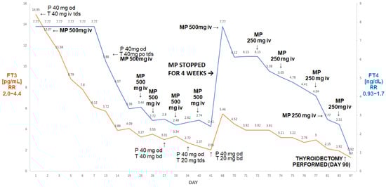 A summary of concentrations of free T4 and free T3 of a 50-year-old male patient with AIT (Case II). The administration of three pulses of 250 mg of ivMP resulted in the normalisation of free T3 prior to the thyroidectomy. Abbreviations: iv—intravenous; T—thiamazole; bd—twice a day; tds—three times a day; LT4—levothyroxine; FT4—free T4; FT3—free T3; RR—reference range; MP—methylprednisolone.