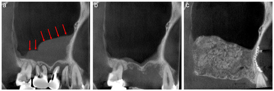 A 58-year-old male was referred to our clinic by his dentist for implant treatment of the right maxilla in 2018. Well-defined, faintly radiopaque antral lesions were observed on the mesiodistal section of the CT image acquired at the first visit. Moreover, marked alveolar bone resorption was observed in the regions surrounding 16, 15, and 14 (Figure 1a, red arrows). The requirement for extraction of these teeth and sinus floor elevation for implant treatment was explained to the patient. The well-defined, faintly radiopaque antral lesions were found to have disappeared on the CT image acquired 3 months after the extractions (Figure 1b); thus, sinus floor elevation was performed using β-TCP granules (Osferion; Olympus Terumo Biomaterials, Tokyo, Japan) alone and 17 was extracted simultaneously at our clinic. CT images acquired 6 months postoperatively revealed a radiopaque area at the site that underwent sinus floor elevation. Swelling of the sinus membrane was not observed (Figure 1c).
