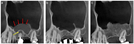 The mesiodistal section of CT images of the right maxillary sinus. (a) Antral, well-defined, faintly radiopaque lesions (red arrows) and marked alveolar bone resorption are observed near 16, 15, and 14. (b) The well-defined, faintly radiopaque antral lesions disappeared 3 months after extraction. (c) A radiopaque area is observed at the sinus floor elevation without swelling of the sinus membrane six months postoperatively.