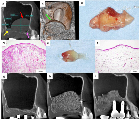A 64-year-old woman scheduled to undergo implant placement for the replacement of 15, 16, and 17, was referred to our clinic in 2021 for sinus floor elevation owing to insufficient bone height. Two well-defined, faintly radiopaque lesions were observed on the mesiodistal section of the CT image acquired at the first visit. The medial lesion was large (Figure 3a, red arrow), whereas the distal lesion was small (Figure 3a, yellow arrow). A radiolucent area was observed in the antero-inferior region of the large medial lesion (Figure 3a, pink arrow). The inner view of the mesiodistal section of the volume-rendering image revealed that the base of the large lesion was located in the superior area of the lateral wall (Figure 3b, green arrow). The radiolucent area appeared to be a space between the floor of the sinus and the large drooping medial lesion on the images (Figure 3a, pink arrow). The lesions were enucleated and examined histologically before sinus floor elevation.