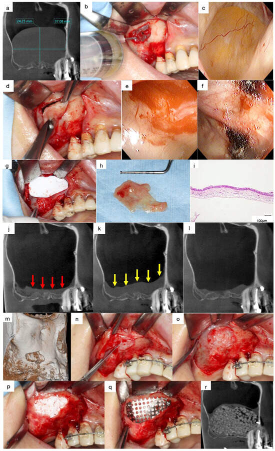 (a) Mesiodistal section of the CT images acquired at the first visit. A large, well-defined, and faint radiopaque lesion can be observed in the maxillary sinus. (b) Preliminary suction of the lesion contents was performed using a fine 18-gauge needle. (c) Endoscopic view of the antral pseudocyst (AP) after suction of the contents. The AP has reduced in size compared to that observed on the CT images during the preliminary section. (d) The surface of the AP was clamped with forceps and herniated through the bony window with gentle outwards traction. (e) Endoscopic view of the enucleated area. A contentious haemorrhage was observed at the base of the AP. (f) Oxidised regenerated cellulose was applied to stop bleeding. (g) The bony window is covered with a resorbable collagen membrane to reduce blood flow into the sinus cavity. (h) The AP was enucleated as a lump with a base. (i) Histological specimen of the enucleated AP (haematoxylin and eosin staining). The outer surface of the lesion was lined with ciliated columnar epithelium and the inner surface was lined with fibrous connective tissue without epithelium. (j) Mesiodistal section of the CT image obtained after enucleation. A flat, faintly radiopaque area can be observed, demonstrating an accumulation of physiological saline or blood at the bottom of the maxillary sinus (red arrows). (k) Swelling of the sinus membrane increased one-week following enucleation (yellow arrows). (l) Swelling of the sinus membrane decreased three months after enucleation. (m) Volume-rendering image obtained three months after enucleation. The bone defect persists in the bony window. (n) Dissection of the scar tissue between the sinus membrane and oral mucosa was necessary at the bone defect area to avoid perforation of the sinus cavity. (o) Scar tissue was observed in the bone defect area without perforation after the elevation of the mucoperiosteal flap. (p) β-TCP granules fill the space between the elevated periosteum and the exposed bone surface of the maxillary sinus. (q) The bony window was tightly covered with a titanium mesh plate and three titanium microscrews. (r) Mesiodistal section of the CT image obtained after sinus floor elevation. Sufficient radiopaque granules can be observed in the augmented area.