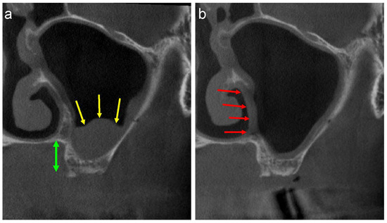Endoscopic intranasal sinus surgery, a method commonly used to remove maxillary sinus cysts, is another surgical procedure commonly used for the enucleation of APs [20,21]. However, this surgery is usually performed by an ENT surgeon under general anaesthesia. The medial wall of the maxillary sinus must be removed when the surgeon approaches the inferior nasal meatus in this approach. Sinus floor elevation is difficult to perform in cases where the distance between the alveolar crest and the floor of the nasal cavity is short (Figure 6a, green arrows) owing to the bone defect in the medial wall (Figure 6b, red arrows). Therefore, a preoperative discussion between the ENT and oral surgeons is necessary.