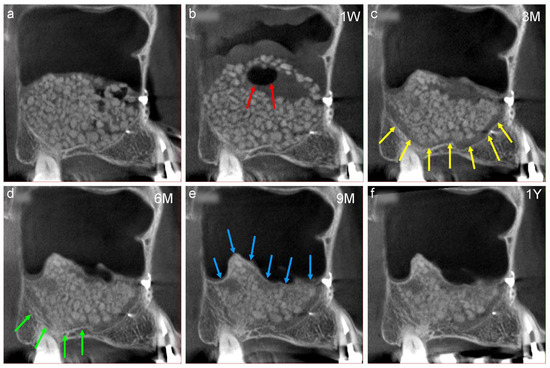 (a) Mesiodistal section of the CT image obtained after sinus floor elevation. Sufficient β-TCP granules are observed at the augmented area. (b) One week after surgery, the β-TCP granules moved upward owing to postoperative swelling of the sinus membrane. An air around β-TCP granules has accumulated at the upper portion of the augmented area (red arrows). 1W; one week follow-up (c) Swelling of the sinus membrane disappeared spontaneously three months postoperatively, and a belt-shaped radiolucency (grey zone) is observed at the interface between the β-TCP granules and the surface of the maxillary sinus (yellow arrows). 3M; three months follow-up (d) The radiopacity of the original cortical bone decreased six months postoperatively, and that of the grey zone increased (green arrows). 6M; six months follow-up (e) A complete radiopaque line (white line) is observed at the newly formed bottom of the maxillary sinus (blue arrows) nine months postoperatively. 9M; nine months follow-up (f) The white line becomes clear 12 months postoperatively; however, the β-TCP granules in the central area retained their shape. 1Y; one year follow-up.