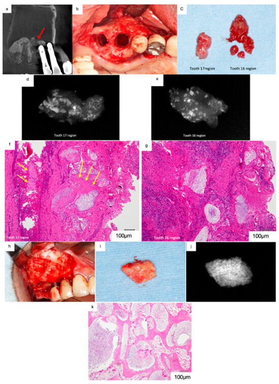 The removal of the soft tissue surrounding 17 and 16 revealed artificial bone granules (Figure 9b,c). Radiographs acquired subsequently revealed radiopaque particles of varying sizes within the tissues (Figure 9d,e). The demineralised histological specimen (H&E staining) revealed the presence of Bio-Oss granules in the fibrous connective tissues (Figure 9f,g). Moderate infiltration of inflammatory cells was observed in the fibrous connective tissues in the regions surrounding 17, and only small bone tissues were observed beside the Bio-Oss granules (Figure 9f, yellow arrows). In contrast, severe infiltration of inflammatory cells was observed in the regions surrounding 16, and no live bone was observed around the Bio-Oss granules (Figure 9g). These findings suggest that peri-implantitis disrupted osseointegration and that Bio-Oss granules were isolated from the newly formed bone tissue. Furthermore, the infection spread to the maxillary sinus through the Bio-Oss granules in the regions surrounding 16, leading to sinusitis.
