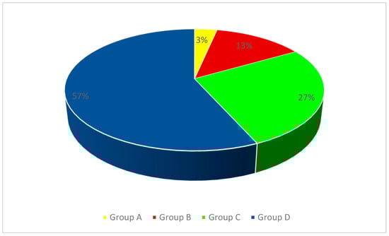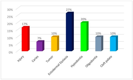 Due to the ages of the subjects and the degree of development of the stomatognathic system, the patients were divided into four groups. For patients of developmental age, the Carrel and Chialastri classification was used [], which is most often used by clinicians conducting interdisciplinary treatment in children and adolescents. It divides patients with missing teeth into three age groups (A, B, C).The classification was modified by adding group D, which included patients with completed bone growth, who, due to disorders of the stomatognathic system resulting from congenital or acquired defects from an early age, were under the care of doctors of various specialties, and the completion of bone growth allowed for the use of supplements recommended in the group of adult patients. Group A included children up to 6 years of age, Group B included patients between 6 and 12 years of age, Group C included adolescents over 12 years of age, and Group D included patients with completed bone growth (young adults). The study group included patients whose abnormalities were a consequence of congenital developmental disorders, such as ectodermal dysplasia (DE), hypodontia, oligodontia, cleft lips and/or palates, as well as trauma, caries, or neoplastic processes in the facial part of the skull. The percentage distribution of patients from individual age groups is presented in Figure 1 (group A—1 patient; group B—4 patients; group C—8 patients; group D—17 patients), while the distribution of patients in the study group depending on the cause of the stomatognathic system disorder is shown in Figure 2 (group A—ectodermal dysplasia (1 patient); group B—caries (1 patient), tumor (2 patients), oligodontia (1 patient); group C—injury (2 patients), caries (1 patient), tumor (1 patient), ectodermal dysplasia (2 patients), hypodontia (1 patient), cleft palate (1 patient); group D—injury at an early age (3 patients), ED (5 patients), hypodontia (5 patients), oligodontia (2 patients), cleft palate (2 patients)).