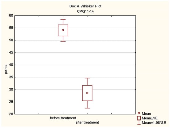 Box plot of CPQ 11-14 before and after treatment.