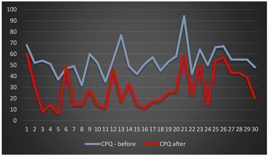 Before the prosthetic treatments, the highest values in the individual questionnaires were, respectively, CPQ 11-14—94 points; OQLQ—64 points; and PIDAQ—68 points. The following values were obtained after the treatments: CPQ 11-14—60 points; OQLQ—48 points; and PIDAQ—44 points. A statistical analysis was performed on the data obtained before and after prosthetic rehabilitation in the CPQ 11-14 Child Perception Questionnaire. Student’s t-test was used for the dependent samples for the significance level of p ≤ 0.05. The SUMA CPQ11-14 study showed a statistically significant difference in the assessment of patients before (mean = 54; standard deviation = 12.43) and after the treatments (mean = 28.57; standard deviation = 17.04) (t-test values = 10.2895479, p = 0.00). The results are depicted in the diagram below (Figure 3).