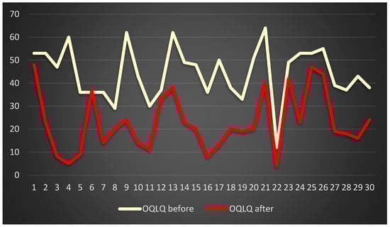 A statistical analysis of the results of the Orthognathic Quality of Life Questionnaire (OQLQ) was performed. Student’s t-test was used for the dependent samples for the significance level of p ≤ 0.05. The OQLQ study showed a statistically significant difference in the assessment of patients before (mean = 44.4; standard deviation = 11.63) and after treatment (mean = 22.27; standard deviation = 12.91) (t-test values = 9.229346, p = 0.00). The results are presented in the diagram below (Figure 4).