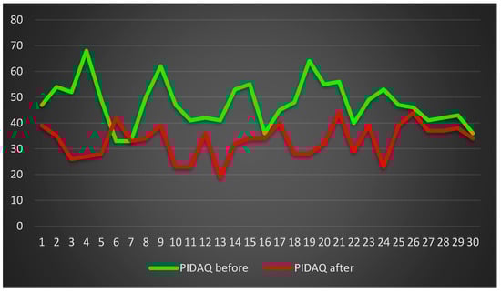 In the statistical analysis of the results of the PIDAQ (Questionnaire of the Psychosocial Impact of Dental Aesthetics), Student’s t-test was applied for the dependent samples with the significance level of p ≤ 0.05. The SUMA PIDAQ study showed a statistically significant difference in the assessment of patients before (mean = 47.6; standard deviation = 8.67) and after the completion of interdisciplinary rehabilitation (mean = 34.03; standard deviation = 6.71) (t-test = 6.79960281, p = 0.00). The results are presented in the diagram below (Figure 5).