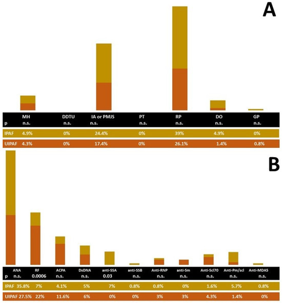 Distribution of the clinical (A) and serological (B) IPAF items in the cohort with IPAF and UIPAF. Legend: ANA: antinuclear antibodies; ACPA: anti cyclic citrullinated antibodies; DDTP: distal digital tip ulcerations; DO: digital oedema; GP: Gottron’s Papules; IA: inflammatory arthritis; NSIP: nonspecific interstitial pneumonia; OP: organizing pneumonia; PMJS: polyarticular morning joint stiffness of at least 1 h; PT: palmar telangiectasia; RF: Rheumatoid Factor.