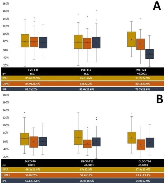 From a functional point of view, at the baseline, the three groups showed similar values of FVC, but IPAF showed significantly higher values of DLCO. During the 24-month follow-up, values of FVC were stable in IPAF (FVC p = 0.23, DLCO p = 0.06). A significant functional impairment was noted in UIPAF for both FVC (p = 0.02) and DLCO (p = 0.048). The IPF cohort reported a significant impairment of FVC (p ≤ 0.0001) but not of DLCO (p = 0.08). Figure 4 reports the mean values of functional parameters in the two cohorts.