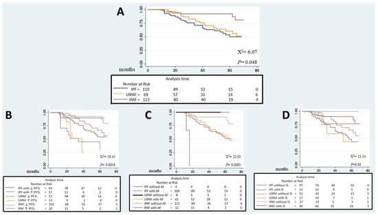 Kaplan–Meier survival curve of the three cohorts. (A): crude mortality after adjusting for age and gender; (B): mortality of the three cohorts based on the functional impairment; (C): mortality of the three cohorts stratified according to the treatment with antifibrotics; (D): mortality of the three cohorts based on the treatment with immunosuppressants; Legend: AF: antifibrotic; IS: immunosuppression; PFTs: pulmonary function tests ↓: lower; ↑: higher.