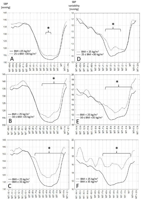 Systolic blood pressure values and variability in different BMI groups. (A–C)—Systolic blood pressure values in different hours before and after wake-up time in different BMI groups. (D–F)—Systolic blood pressure variability calculated as the average absolute value of the difference between the consecutive blood pressure recordings in different hours before and after wake-up time in different BMI groups: body mass index, WT: wake-up time. *—differences are statistically significant when p > 0.05.
