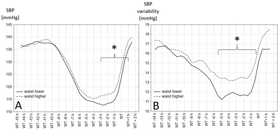 Systolic blood pressure values and variability in two waist circumference groups. (A)—Systolic blood pressure values in different hours before and after wake-up time in two waist circumference groups. (B)—Systolic blood pressure variability calculated as the average absolute value of the difference between the consecutive blood pressure recordings in different hours before and after wake-up time in two waist circumference groups. *: differences are statistically significant with p > 0.05, WT: wake-up time.