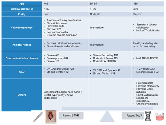 The safety and efficacy of TAVR has been well established in patients with severe AS in a series of randomized clinical trials across the entire spectrum of surgical risk. Both the American College of Cardiology/American Heart Association (ACC/AHA) and European Society of Cardiology (ESC) guidelines for the management of patients with valvular heart disease have been updated and provide recommendations; however, the clinical decision between TAVR vs. SAVR requires the consideration of multiple and complex clinical and anatomical factors (Table 1, Figure 1) [4,5].