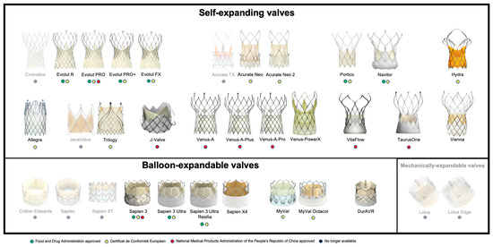 As TAVR is being increasingly adopted across the globe [2], and new THV, as well as new THV iterations, are being developed. The main design classification applied to THV is in regard to the mechanism of valve expansion, and includes self-expanding valves (SEV), balloon-expandable valves (BEV) or mechanically expandable valves (MEV), as shown in Figure 2 and Table 2.