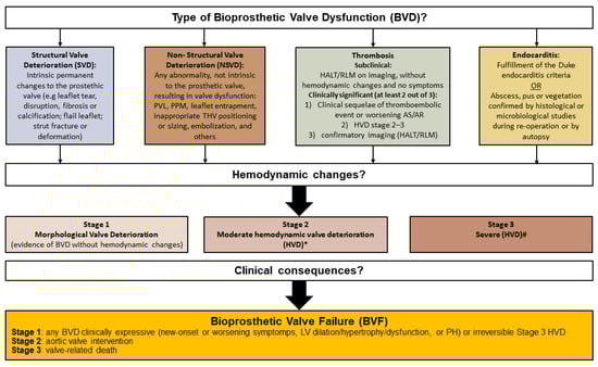 Classification of bioprosthetic valve dysfunction (BVD) and bioprosthetic valve failure (BVF) [30]. * Moderate HVD: Increase in mean trans-valvular gradient ≥ 10 mmHg resulting in mean gradient ≥20 mmHg with concomitant decrease in EOA ≥0.3 cm2 or ≥25% and/or decrease in Doppler velocity index ≥0.1 or ≥20% compared with echocardiographic assessment performed 1–3 months post-procedure, OR new occurrence or increase of ≥1 grade of intra-prosthetic AR resulting in ≥ moderate AR. # Severe HVD: Increase in mean transvalvular gradient ≥20 mmHg resulting in mean gradient ≥30 mmHg with concomitant decrease in EOA ≥0.6 cm2 or ≥50% and/or decrease in Doppler velocity index ≥0.2 or ≥40% compare with echocardiographic assessment performed 1–3 months post-procedure, OR new occurrence, or increase of ≥2 grades of intra prosthetic AR resulting in severe AR. AR: aortic regurgitation; AS: aortic stenosis; HALT: hypo-attenuated leaflet thickening; LV: left ventricle; PH: pulmonary hypertension; RLM: reduced leaflet motion.