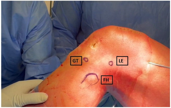 Skin landmarks. GT: Gerdy’s tubercle, LE: lateral epicondyle, FH: fibular head.