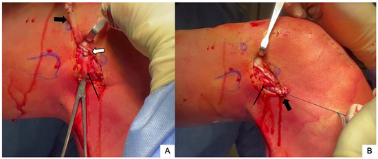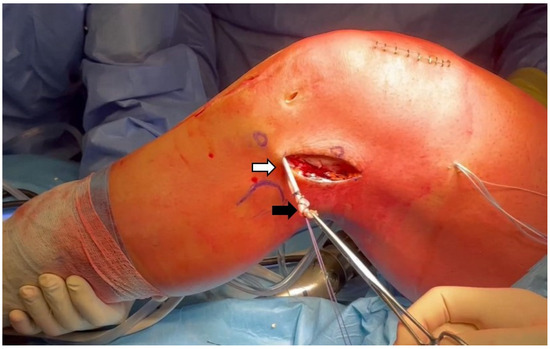ITB strip harvesting and preparation. Harvesting of a strip from the central third of the ITB (8 × 1 cm) (white arrow). Its distal insertion is preserved while the proximal part is armed with a number-2 multifilament adsorbable suture (black arrow).
