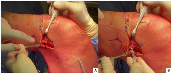 A 90° suture passer is advanced deep into the LCL and directed anteriorly until it can be palpated. A second 1 cm sharp incision is made parallel to the LCL at the tip of the suture passer. The suture passer is then used to retrieve the polyglactin arming sutures deep in the LCL through the proximal incision (Figure 4A).
