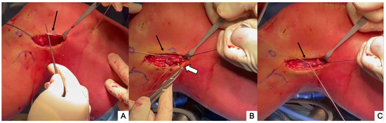 With the help of a probe inserted under the ITB, the high-resistance sutures (thin black arrow) of the adjustable loop are retrieved (A) and a free needle is used to pass them through the proximal part of the ITB strip (white arrow) (B). Final fixation is then performed with the knee at 30° of flexion and neutral rotation (C).