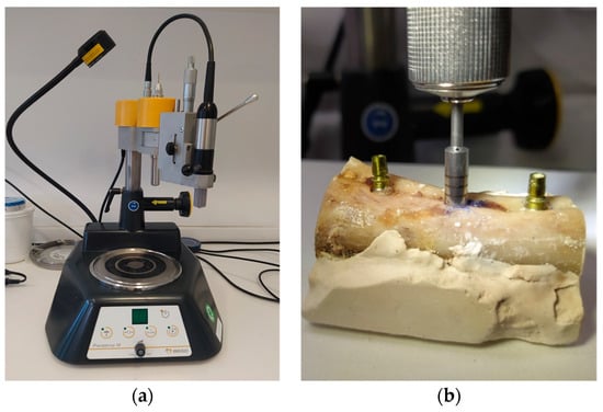 Uncooked bovine ribs were used for the implantation because they have the same properties as a human jawbone. The ribs were encased in SnowWhite plaster to ensure stability. As a next step, eleven Xive® implants (Dentsply Sirona, Bensheim, Germany) with a diameter of 3.8 mm and a length of 11 mm were placed in the bones. The implantation was carried out according to the protocol specified by the manufacturer. All drilling was carried out with a fixed drill bit, which ensured that the identical axis could be maintained exactly every time. (Figure 1a) Subsequently, implants were placed. Insertion torque exceeded 25 Ncm for all implants.