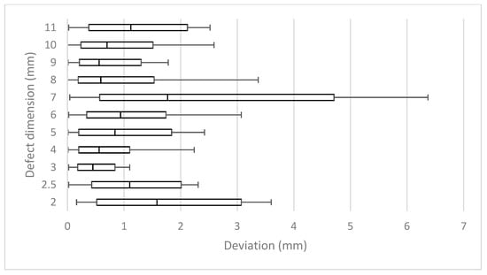 Mean measurement errors of all 11 defects (2.5–11 mm) of all horizontal and vertical deflections.