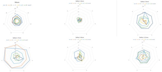 The largest average deviation of the defects occurred at the −8° horizontal and −15° vertical degree settings. Rotating in the negative degree range brought the defect closer to the radiation source. At the same time, the distance to the image sensor increased. Consequently, distortion was more pronounced and measured lengths, and therefore, the differences to the real lengths were larger in all values of the negative direction of rotation (Figure 6).
