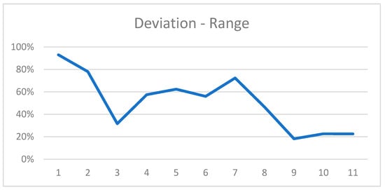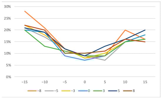 Relative mean deviations in regard to deflection across all 11 defects. (columns—horizontal deflection (−8° to +8°), lines—vertical deflection (−15° to +15°)).
