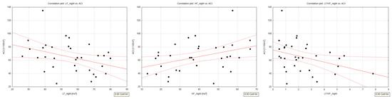 Correlation plots for ACI vs. LF_night (left chart, R = −0.38; p = 0.027), HF_night (middle chart, R = 0.39; p = 0.027), and LF/HF (right chart, R = −0.36; p = 0.037). (Point and line graph—graphical representation of strength and direction of correlation).