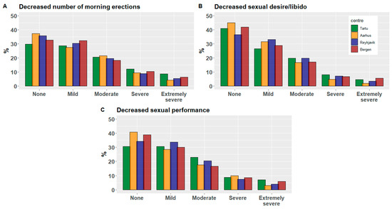 Distribution of severity scores for decreased number of morning erections (A), decreased sexual desire/libido (B) and decreased sexual performance (C) across study centers Tartu, Aarhus, Reykjavik and Bergen.