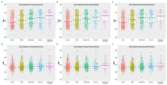 The association between age (A–C) and BMI (Body Mass Index) (D–F) and severity scores in three sexual function parameters of the Aging Males’ Symptoms (AMS) scale.