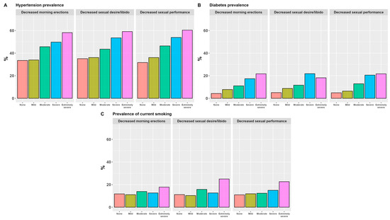The percentage of reported hypertension (A), diabetes (B) and current smoking (C) on severity scores in three sexual function parameters of the sexual subscale of the Aging Males’ Symptom (AMS) scale.