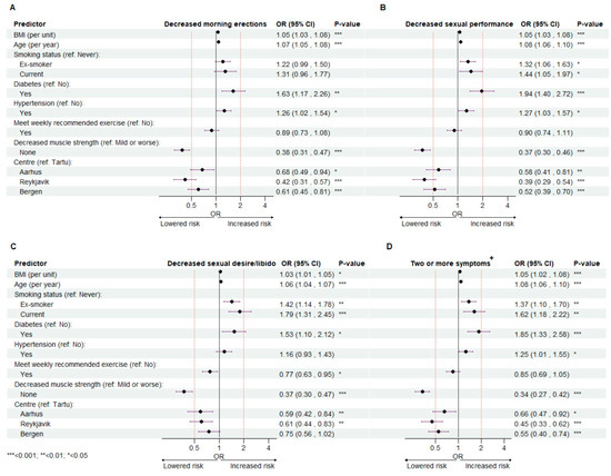 In Figure 4, forest plots display the outcomes of the modelled association between decreased morning erections (A), sexual performance (B), sexual desire/libido (C), suffering two or more sexual symptoms (D) and BMI, age, smoking status, diabetes, hypertension, exercise level, muscle strength and study center. Associations are shown as adjusted odds ratios (ORs) with corresponding 95% confidence intervals (95% CI) and significance levels (p-values).