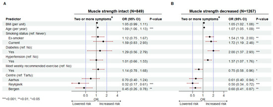 Subsequently, we divided the total population by muscle strength and conducted stratified regression analyses. In the strata reporting, no decrease in muscle strength, BMI, former and current smoking, diabetes and hypertension are no longer significant predictors of reporting two or more sexual symptoms (Figure 5A). This contrasts with the strata reporting decreased muscle strength, where BMI, former and current smoking, diabetes and hypertension are significant risk factors. Meeting recommended weekly exercise is associated with significantly lower odds, but only in the decreased muscle strength strata (OR 0.75 (0.58–0.96)) (Figure 5B). Age, however, is still a significant risk factor in both strata, with every additional year lived associated with increased odds of negative outcome (Figure 5A,B). Finally, we conducted supplementary subgroup analyses where we stratified the population by their self-reported health. In Figure A3 (Appendix D) we have isolated the model coefficient for decreased muscle strength from all three stratified models. We show that reporting to suffer no decrease in muscle strength remains statistically significant across three different levels of self-reported health.