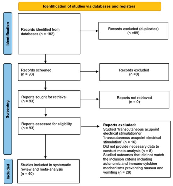 In total, 182 articles were initially identified (Figure 1). Of them, 89 duplicates were removed. Subsequently, 93 RCTs were screened. After screening the titles and abstracts, 53 articles were excluded. Finally, a total of 40 articles [2,13,34,35,36,37,38,39,40,41,42,43,44,45,46,47,48,49,50,51,52,53,54,55,56,57,58,59,60,61,62,63,64,65,66,67,68,69,70,71] with 2265 (TENS—1137, control—1128) patients were included in the meta-analysis (Table 1).